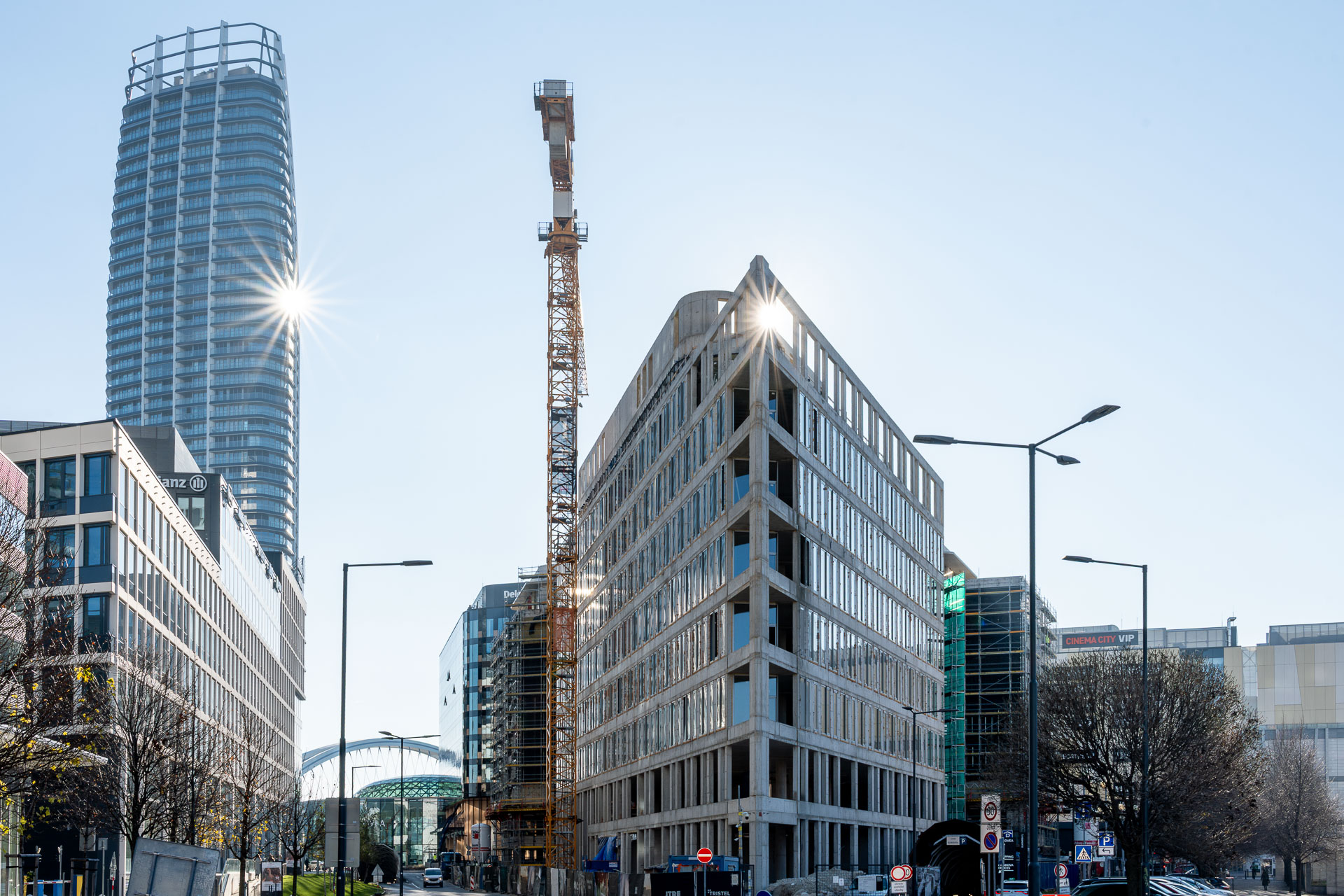 Aj administratívna časť projektu napreduje dynamicky, pričom prebieha realizácia strechy a montujú sa zámočnícke konštrukcie pre technologické jednotky umiestnené na jej úrovni. Aj tu sú okná dokončené na všetkých poschodiach okrem prízemia. Štyri z piatich výťahov sú hotové, pričom v poslednej výťahovej šachte sa nachádza dočasný stavebný výťah. Zároveň začínajú prípravné práce na reprezentatívnom lobby na prízemí kancelárskej časti.